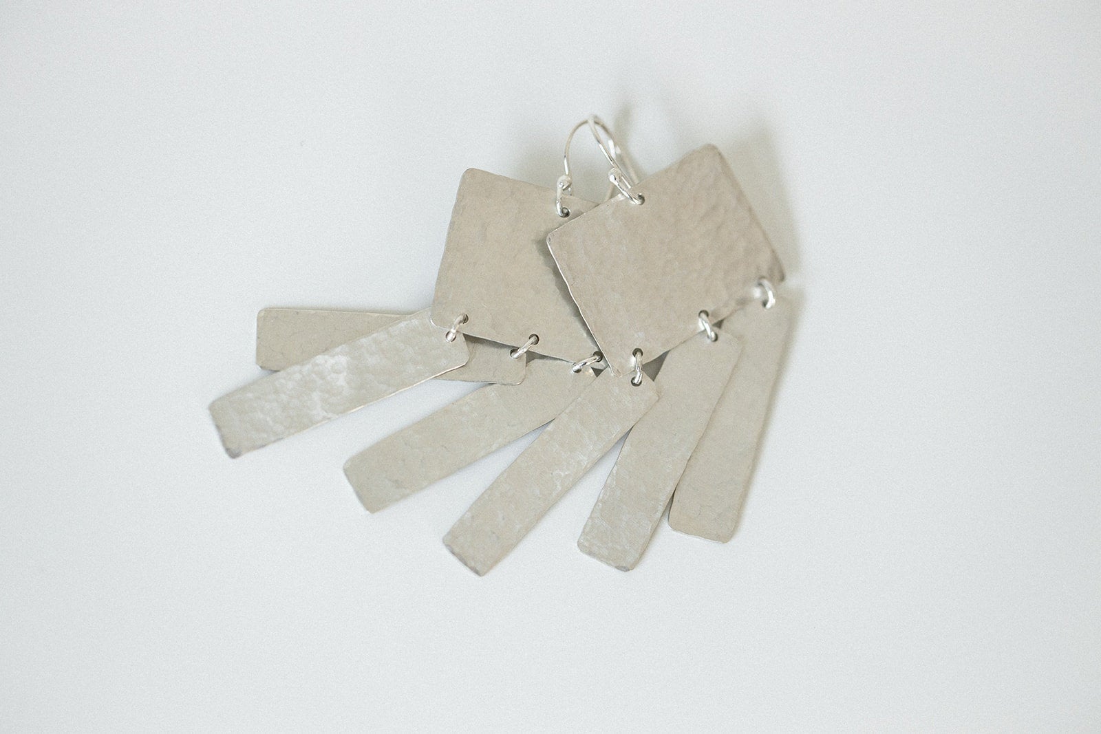 Beautifully handcrafted silver Dangle Earrings, heavy in look yet light on the ears. Light Dancers flicker in the sunlight and are sure to turn heads. These earrings are very elegant and bold and reminiscent of jewellery you might find among Cleopatra's treasures. These earrings hang quite beautifully and offer lots of movement. These earrings are entirely hand cut and have a small hammered texture to their finish. Each rectangular piece is connected by a silver jump ring. They hang from a simple silver ear wire.