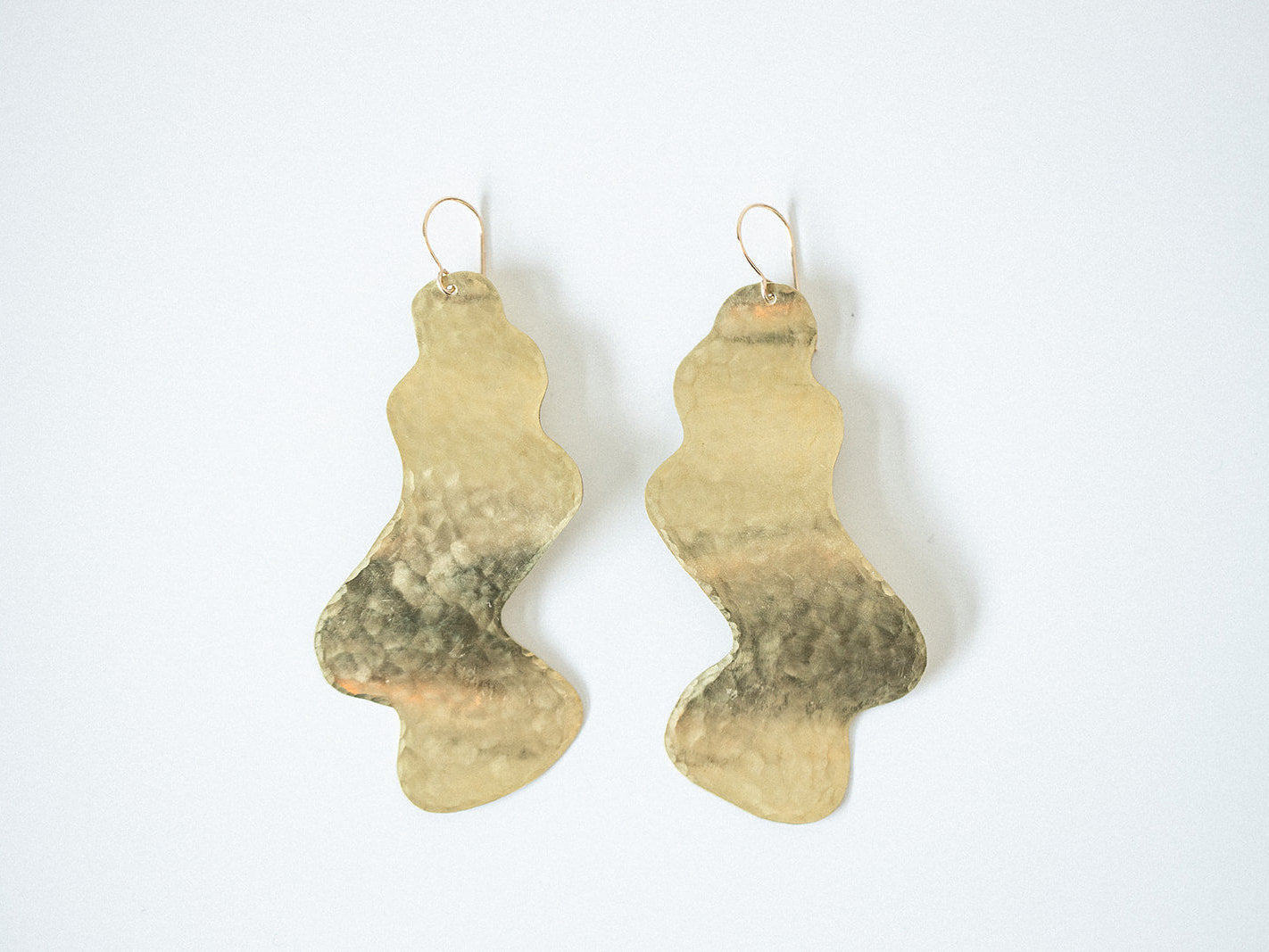 Inspired by water, movement and the female form, The Bay Earrings are full of beautiful curves mimicking both the waves and the curves of land. They are the perfect accessory to celebrate your inner goddess. This earrings are hand cut and have a large hammered texture for the finish.