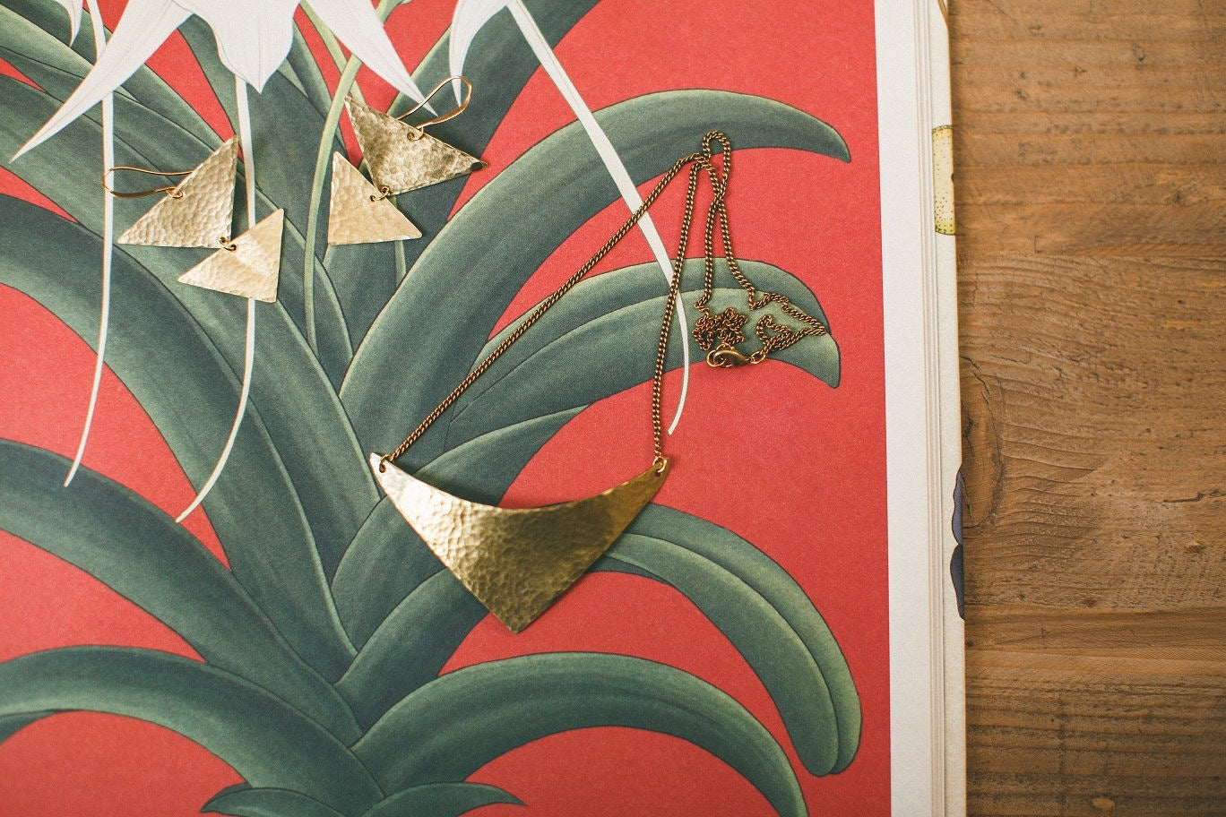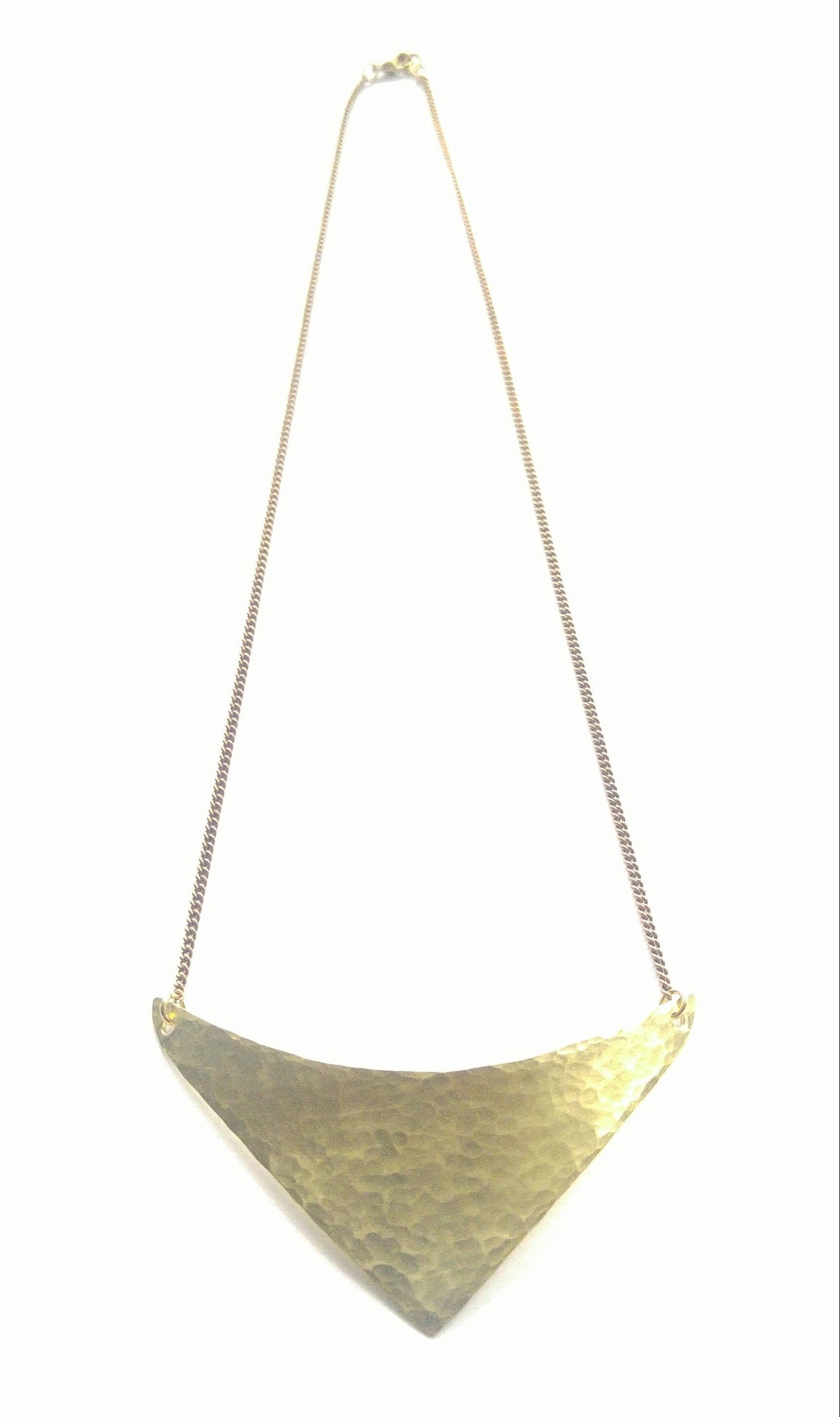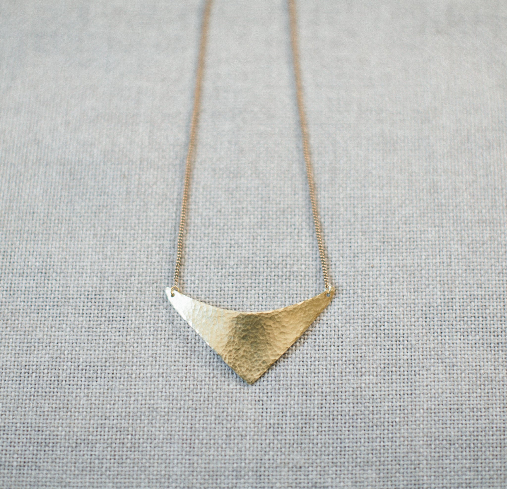 This necklace is hand cut and has a small hammered texture for the finish. The pendant has a slight curve to it and sits beautifully at the collarbone. It hang from an elegant brass chain.