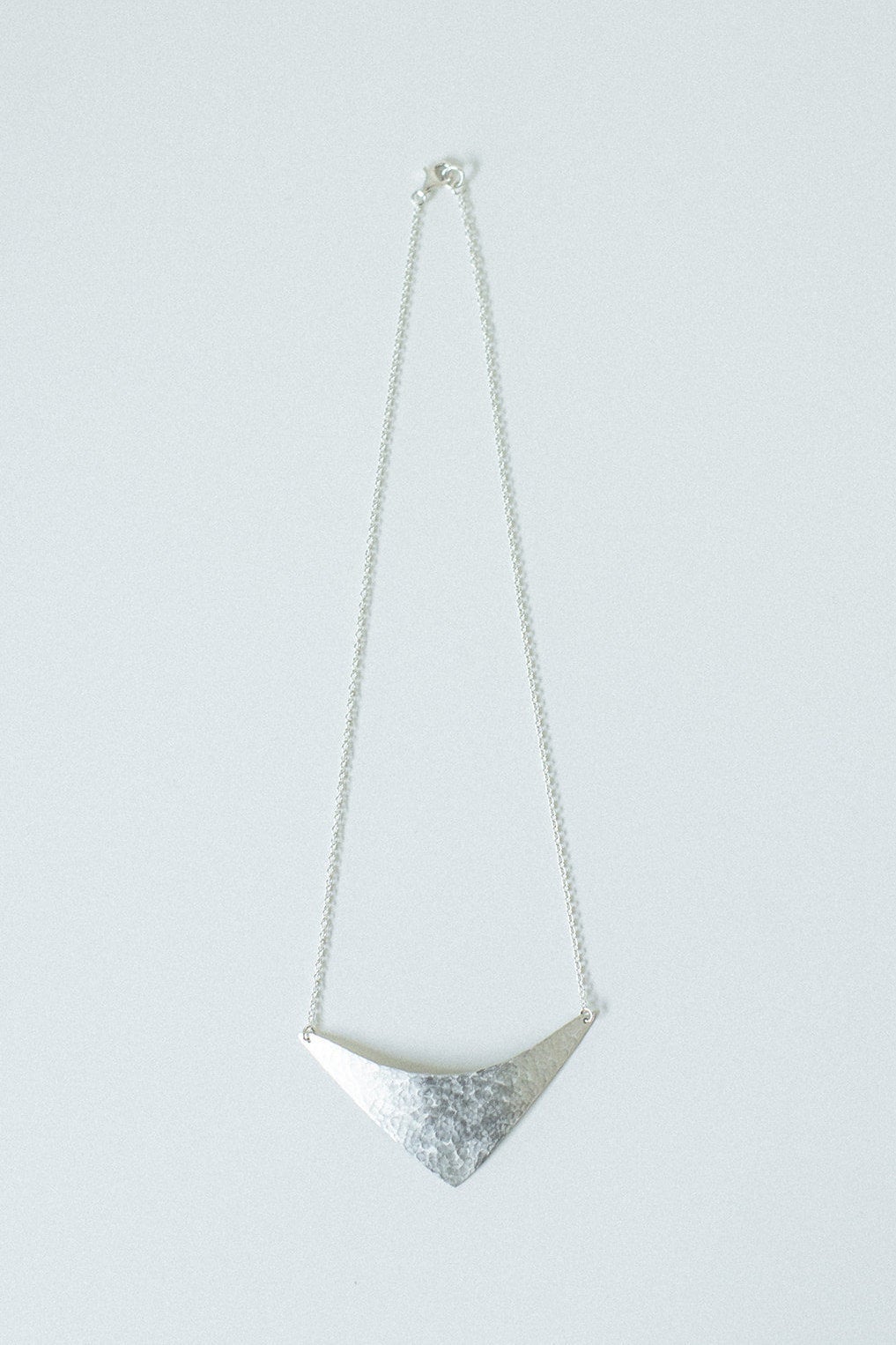 This necklace is hand cut and has a small hammered texture for the finish. The pendant has a slight curve to it and sits beautifully at the collarbone. It hang from an elegant silver chain.