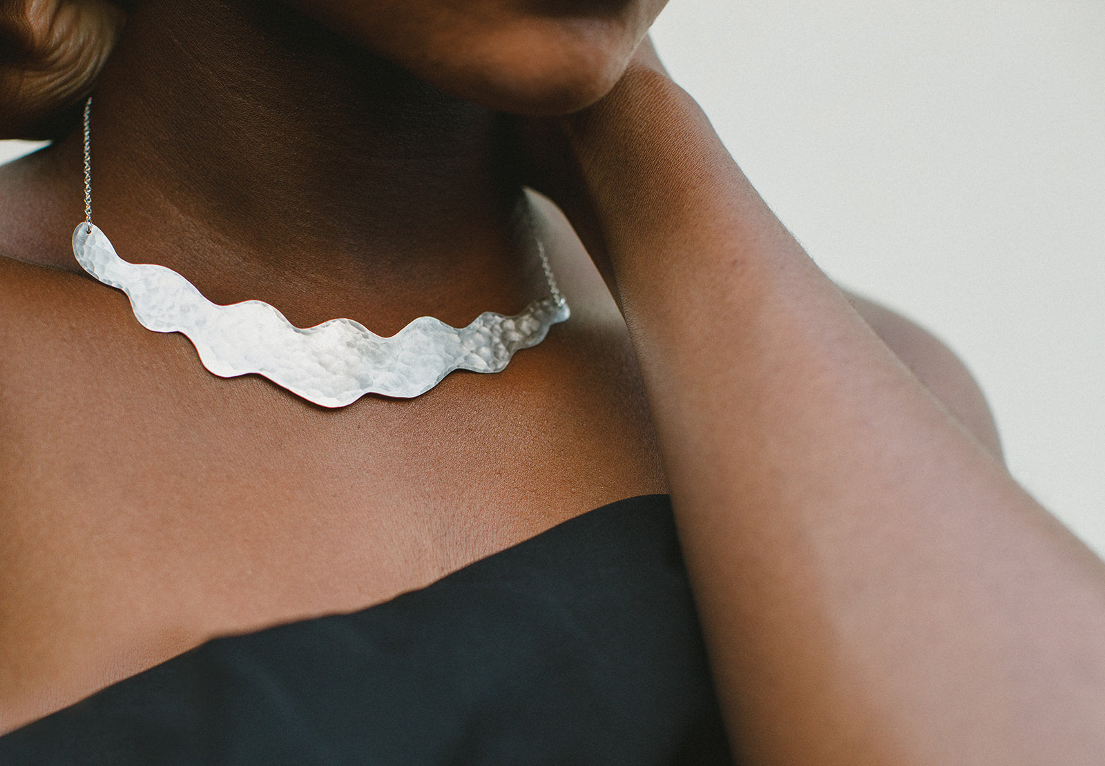 This necklace is hand cut and has a large hammered texture for the finish. Full of beautiful curves mimicking waves, it sits beautifully on the collarbone. It hang from an elegant silver chain.