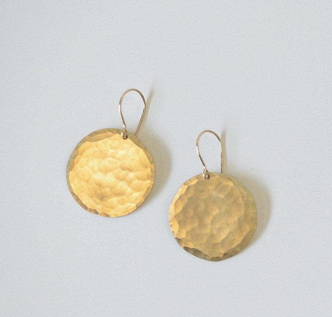 These earrings have a classic design and I really like the texture of the hammered brass. They are super light-weight and can be dressed up or down. Love them!